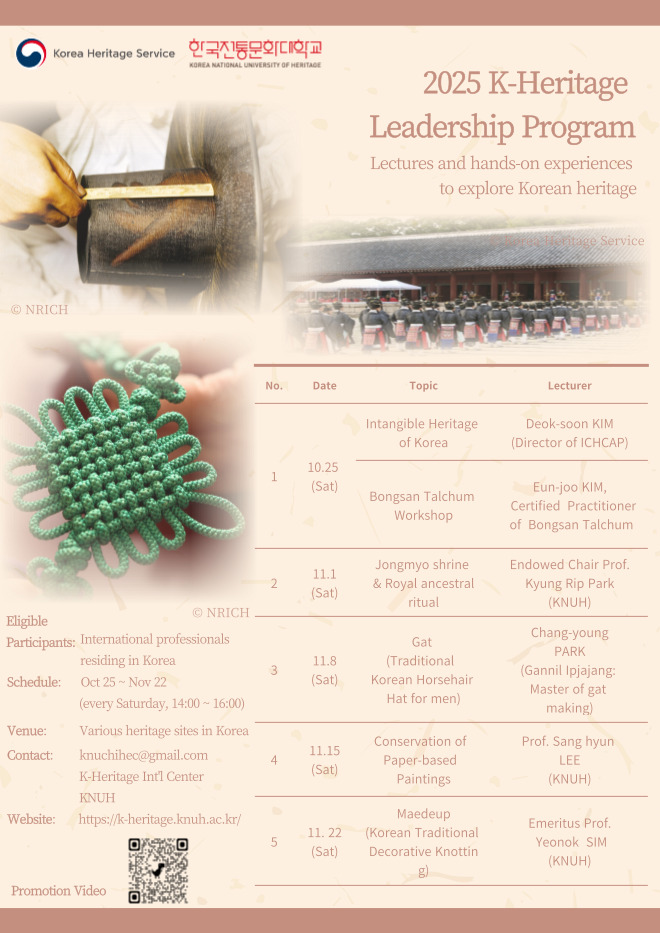 K-Heritage International Center is a key institution for international exchange at the Korean National University of Heritage. The Center plays a vital role in the globalization Korean cultural heritage and in enhancing its international standing through active collaboration with leading universities and cultural heritage organizations around the world.